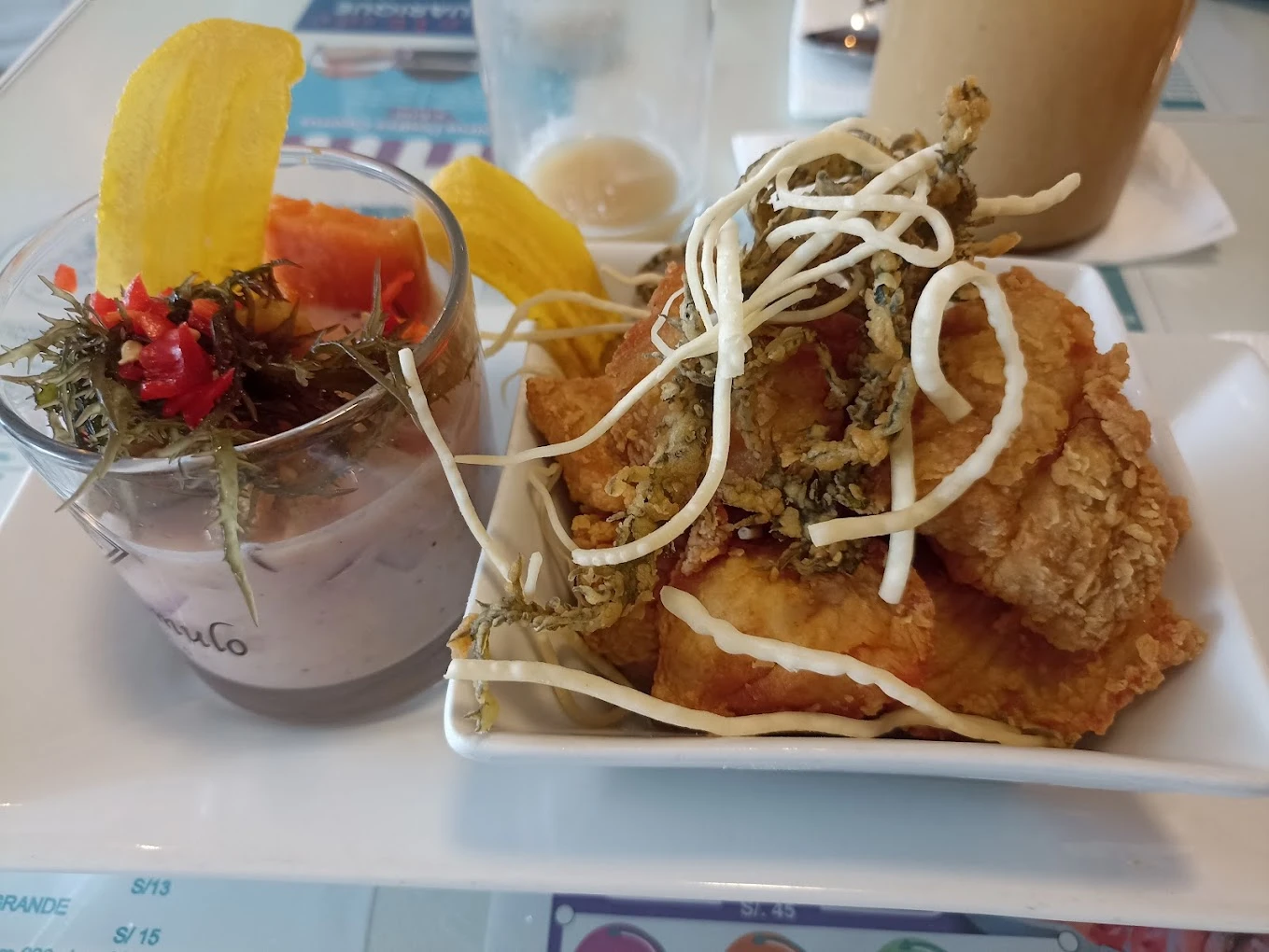 Saborea el clásico Ceviche de Conchas Negras y Pescado, donde la frescura del mar se entrelaza con una explosión de sabores cítricos. El sabor de cada bocado te transportará a las cristalinas aguas del Pacífico. Relájate y sacia tu apetito en un espacio amplio y cómodo, donde el estacionamiento es gratuito y los métodos de pago son flexibles.